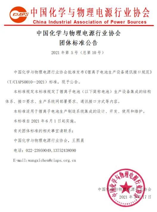 TIES近日,由中國化學(xué)與物理電源行業(yè)協(xié)會牽頭組織、天目湖先進儲能技術(shù)研究院參與起草的兩項團體標(biāo)準(zhǔn)《鋰離子電池生產(chǎn)設(shè)備通訊接口規(guī)范》(T/CIAPS0010―2021)和《鋰離子電池制造術(shù)語》(T/CIAPS0011―2021)獲得了批準(zhǔn)發(fā)布,自2021年6月1日起實施。1《鋰離子電池生產(chǎn)設(shè)備通訊接口規(guī)范》(T/CIAPS0010―2021)標(biāo)準(zhǔn)規(guī)定了鋰離子電池生產(chǎn)設(shè)備集成的結(jié)構(gòu)體系、接口要求、生產(chǎn)系統(tǒng)網(wǎng)部署要求、通訊接口方式等內(nèi)容,適用于鋰離子電池生產(chǎn)制造系統(tǒng)集成的設(shè)計、開發(fā)、使用和維護。2《鋰離子電池制造術(shù)語》(T/CIAPS0011―2021)標(biāo)準(zhǔn)規(guī)定了鋰離子電池制造領(lǐng)域的基礎(chǔ)術(shù)語、電池產(chǎn)品術(shù)語、制造工藝術(shù)語、制造設(shè)備術(shù)語、制造質(zhì)量管理術(shù)語、制造環(huán)境術(shù)語、智能制造術(shù)語、安全類術(shù)語,適用于鋰離子電池制造領(lǐng)域的規(guī)劃、研究、試驗、檢測、管理和生產(chǎn)應(yīng)用等。比亞迪股份有限公司、深圳吉陽智能科技有限公司、合肥國軒高科動力能源有限公司、欣旺達(dá)電子股份有限公司、寧德時代新能源科技有限公司、天津力神電池股份有限公司、無錫先導(dǎo)智能裝備股份有限公司等單位也參與了起草、審定等工作。