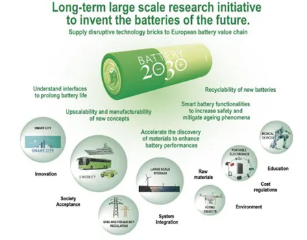 Part I:“電池2030+(BATTERY 2030+)”背景《電池2030+(BATTERY2030+)》是一項(xiàng)大規(guī)模的歐洲長(zhǎng)期研究計(jì)劃,為歐盟委員會(huì)提出的戰(zhàn)略能源技術(shù)計(jì)劃(SET-plan)的想法之一,旨在聯(lián)合歐洲整體解決未來(lái)電池研發(fā)過(guò)程中所面臨的各項(xiàng)挑戰(zhàn),克服重重阻力達(dá)成宏大的既定的電池性能目標(biāo)。研究?jī)?nèi)容以“化學(xué)中性途徑(chemistry neutral approach)”為導(dǎo)向,基于現(xiàn)有或未來(lái)多種不同類型的電池化學(xué)物質(zhì),通過(guò)縮小各自之間的差距來(lái)發(fā)揮其全部潛力以實(shí)現(xiàn)電池的實(shí)際能力和理論極限。理念上基于給歐洲電池企業(yè)乃至全球電池企業(yè)的價(jià)值鏈提供新的發(fā)展和支持,比如從原材料到先進(jìn)材料的發(fā)展,到電池和電池包的設(shè)計(jì)制造,電池壽命終止后的回收利用和電池實(shí)際應(yīng)用場(chǎng)景等。除此之外,《電池2030+》的長(zhǎng)期發(fā)展路線圖也充分地彌補(bǔ)了歐洲電池內(nèi)部的中期研究和創(chuàng)新工作–歐洲技術(shù)和創(chuàng)新平臺(tái)(ETIP)。因此,歐盟希望借助于《電池2030+》來(lái)推動(dòng)歐洲為期10年的大規(guī)模努力以促進(jìn)電池領(lǐng)域的變革性發(fā)展。不斷提出新的研究方法和開(kāi)拓新的創(chuàng)新領(lǐng)域,實(shí)現(xiàn)安全的超高性能電池開(kāi)發(fā),最終實(shí)現(xiàn)歐洲社會(huì)2050年前不再使用化石能源(如圖1所示)。2019年3月,歐盟啟動(dòng)《電池2030+》協(xié)調(diào)和支持行動(dòng),以確定計(jì)劃的研發(fā)路線圖。本次發(fā)布的《電池2030+》研發(fā)路線圖第二版草案經(jīng)討論修改后,將于2020年2月底提交給歐盟委員會(huì)。 圖1. 《電池2030+》的長(zhǎng)期愿景及使命 Part II:“電池2030+”計(jì)劃目標(biāo)《電池2030+》的總體目標(biāo)是實(shí)現(xiàn)具有超高性能和智能化的可持續(xù)電池功能以適用于每個(gè)應(yīng)用場(chǎng)景。所謂超高性能,是指能量和功率密度接近理論極限,出色的使用壽命和可靠性,增強(qiáng)安全性,環(huán)境可持續(xù)性和可擴(kuò)展性,以實(shí)現(xiàn)具有競(jìng)爭(zhēng)力成本的大規(guī)?;a(chǎn)電池。第一個(gè)重要挑戰(zhàn)是達(dá)到最 好的電池性能,因此發(fā)現(xiàn)新材料和新化學(xué)體系的開(kāi)發(fā)過(guò)程必須加快?!峨姵?030+》提出電池界面基因組(BIG)–材料加速平臺(tái)(MAP)計(jì)劃,將采用人工智能(AI)大幅減少電池材料的開(kāi)發(fā)周期。第二個(gè)重要挑戰(zhàn)是延長(zhǎng)單體電池和電池系統(tǒng)的使用壽命和安全性。壽命和安全都對(duì)未來(lái)電池的大小,成本和接受度具有關(guān)鍵性影響。為了實(shí)現(xiàn)第二個(gè)挑戰(zhàn),《電池2030+》提出了兩種不同且互補(bǔ)的建議方案:開(kāi)發(fā)直接在化學(xué)和電化學(xué)反應(yīng)中可探測(cè)的傳感器,將新型傳感器嵌入電池中連續(xù)監(jiān)控其“健康”和“安全狀態(tài)”。另一方面,通過(guò)使用自愈合功能來(lái)提高電池容量并提高電池性能。與目前最 先進(jìn)的電池技術(shù)相比,《電池2030+》旨在提出并影響電池技術(shù)的未來(lái)發(fā)展(如圖2):第一,將電池實(shí)際性能(能量密度和功率密度)和理論性能之間的差距減少至少1/2。第二,至少將電池的耐用性和可靠性提高3倍。第三,對(duì)于給定的電力組合,將電池的生命周期碳足跡減少至少1/5。第四,使電池的回收率達(dá)到至少75%,并實(shí)現(xiàn)關(guān)鍵的原材料回收率接近100%。 圖2.《電池2030+》對(duì)未來(lái)電化學(xué)存儲(chǔ)系統(tǒng)的最 新技術(shù)展望 Part III:“電池2030+”主要研發(fā)方向3.1 材料加速平臺(tái)(Materials Acceleration Platform,MAP)從能源技術(shù)的生產(chǎn),存儲(chǔ)到最終交付使用,材料的發(fā)現(xiàn)和開(kāi)發(fā)始終貫穿于整個(gè)過(guò)程。特別對(duì)于新興的電池技術(shù),先進(jìn)材料幾乎是所有清潔能源創(chuàng)新的基礎(chǔ)。若依靠現(xiàn)有的傳統(tǒng)重復(fù)性試驗(yàn)開(kāi)發(fā)過(guò)程,需要耗費(fèi)大量的時(shí)間,人力物力去開(kāi)發(fā)新型高性能電池材料并用于電池設(shè)計(jì),這一過(guò)程從最初發(fā)現(xiàn)到完全實(shí)現(xiàn)商業(yè)化可能長(zhǎng)達(dá)10年之久。因此,在《電池2030+》項(xiàng)目中,為了加速超高性能的,可持續(xù)發(fā)展的智能型電池開(kāi)發(fā),計(jì)劃在歐洲范圍內(nèi)設(shè)立電池“材料加速平臺(tái)(MAP)”,并與電池界面基因組(BatteryInterface Genome,BIG)集成在一起。同時(shí)BIG-MAP基礎(chǔ)設(shè)施模塊化設(shè)置,全系統(tǒng)具有高度的通用性,以便能夠容納所有新興的電池化學(xué)體系,材料成分,結(jié)構(gòu)和界面。另一方面,MAP將利用人工智能(AI)從許多互補(bǔ)的方法和技術(shù)中集成和編排數(shù)據(jù),整合計(jì)算材料設(shè)計(jì),模塊化和自主性綜合機(jī)器人技術(shù)和先進(jìn)表征,實(shí)現(xiàn)全新的電池開(kāi)發(fā)策略。促進(jìn)材料,工藝和設(shè)備的逆向設(shè)計(jì)和定制。最終,在MAP框架下由每個(gè)核心元素構(gòu)建概念電池,開(kāi)發(fā)出具有突破性的電池材料,極大提高電池開(kāi)發(fā)速度和電池性能。圖3. 電池材料加速平臺(t